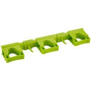 This hygienic, modular wall bracket provides a flexible solution for storing your cleaning tools and utensils in any area of your site. Proper storage of cleaning equipment enhances food safety and extends the shelf life of your equipment. These wall brackets can adjust to any color-coded program. The wall bracket comes with four rubber clips and two side hooks to hold up to 5 tools. The rail easily attaches to the four wall mounts by sliding it on from the right or left side. The grip band modules and hook modules can then be clicked on the rail and locked in place using one of the many small notches in the rail. These ensure that the modules cannot slide from side to side. From one to 10 hanging modules can be placed on the rail (up to five grip band modules or up to 10 hook modules). The system comes with three grip band modules and two hooks. Modules and rails are easy to disassemble for cleaning or replacement. See the videos tab above for an overview of how easy these are to install and configure.