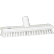 This is an extremely stiff, short-bristled waterfed floor scrub. When dirt is stubborn and sticky, this floor scrub can withstand heavy downward force from the user. Its size makes it ideal for cleaning in narrow spaces. The waterfed floor scrub has a very effective water distribution and is ideal for use in heavily soiled areas such as slaughterhouses and meat processing plants. Fits any Vikan euro-threaded handle (NOT included).
