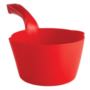 This ergonomically designed round bowl scoop is lightweight, durable and holds 32 oz. It is designed with a pouring spout on 2 sides to enable both left and right hand users to pour from the scoop. Its one-piece construction eliminates areas where bacteria can hide. Smooth surface makes it extremely easy to clean, ideal for use in food production areas for moving food ingredients, liquids etc. There is a measuring scale inside the scoop.